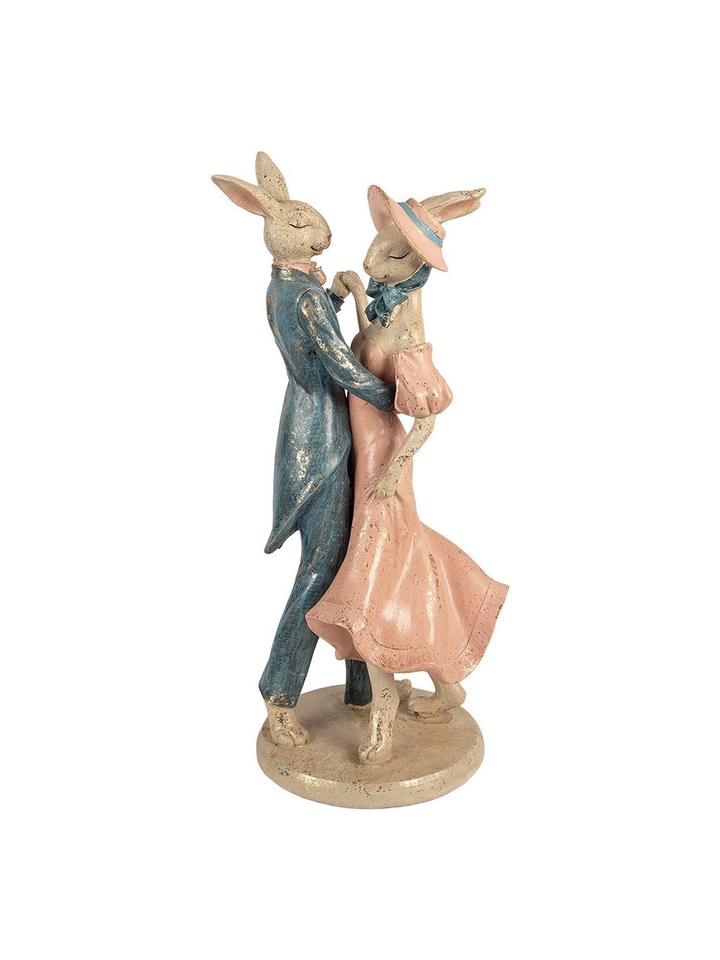 S výškou 47cm ide o výraznú dekoráciu, ktorá krásne vynikne na komode či konzolovom stolíku. Elegantný zajac v tmavomodrom fraku a dáma v staroružových šatách s klobúčikom vytvárajú harmonický kontrast. Jemná patina a zlatisté akcenty dodávajú celej figúrke vintage nádych, ktorý pôsobí veľmi vkusne a nadčasovo.