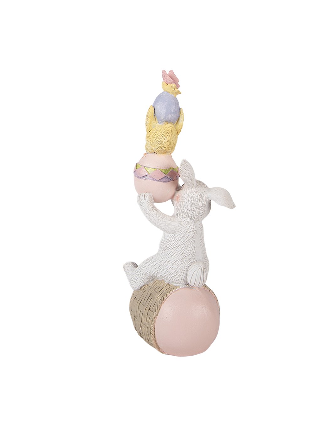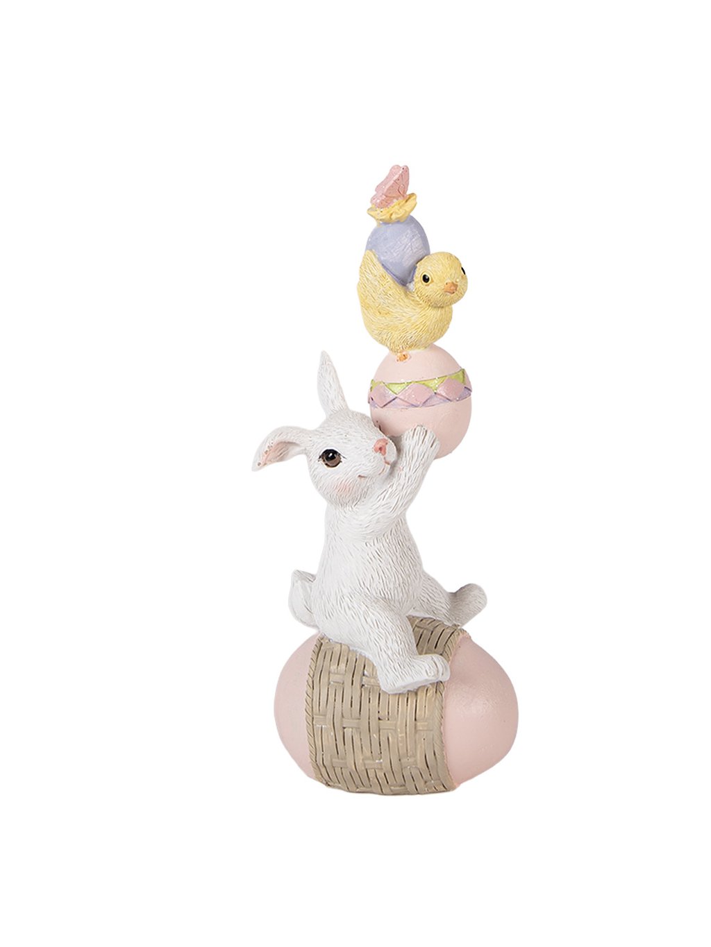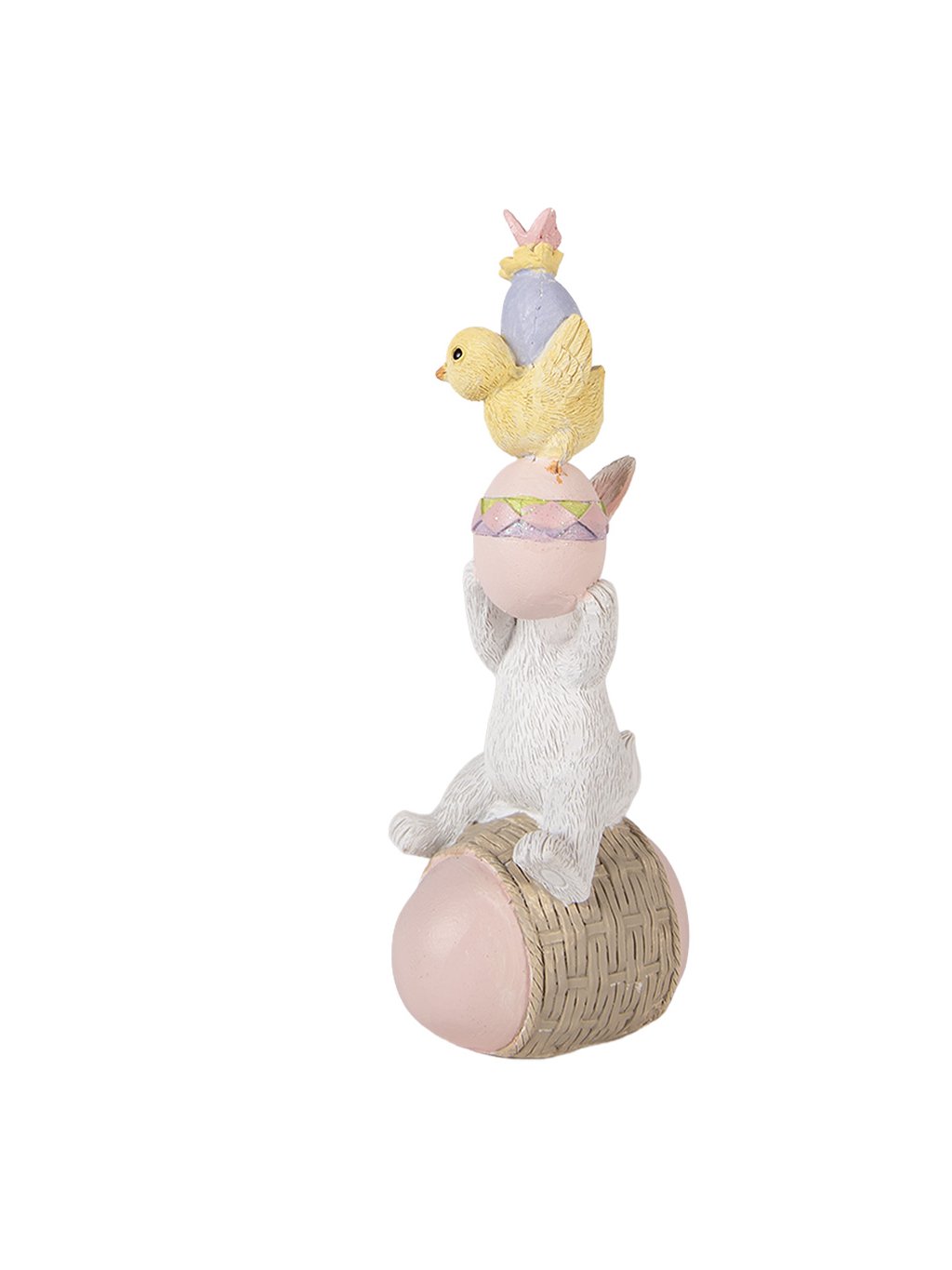 S rozmermi 8 × 6 × 19 cm je ideálny na poličku, komodu či sviatočne prestretý stôl. Biely zajac s jemne modelovanou srsťou sedí na ružovom vajíčku s prúteným detailom a nad ním sa týči pastelová kraslica s malým žltým kuriatkom. Celá kompozícia pôsobí harmonicky, hravo a veľmi príjemne.